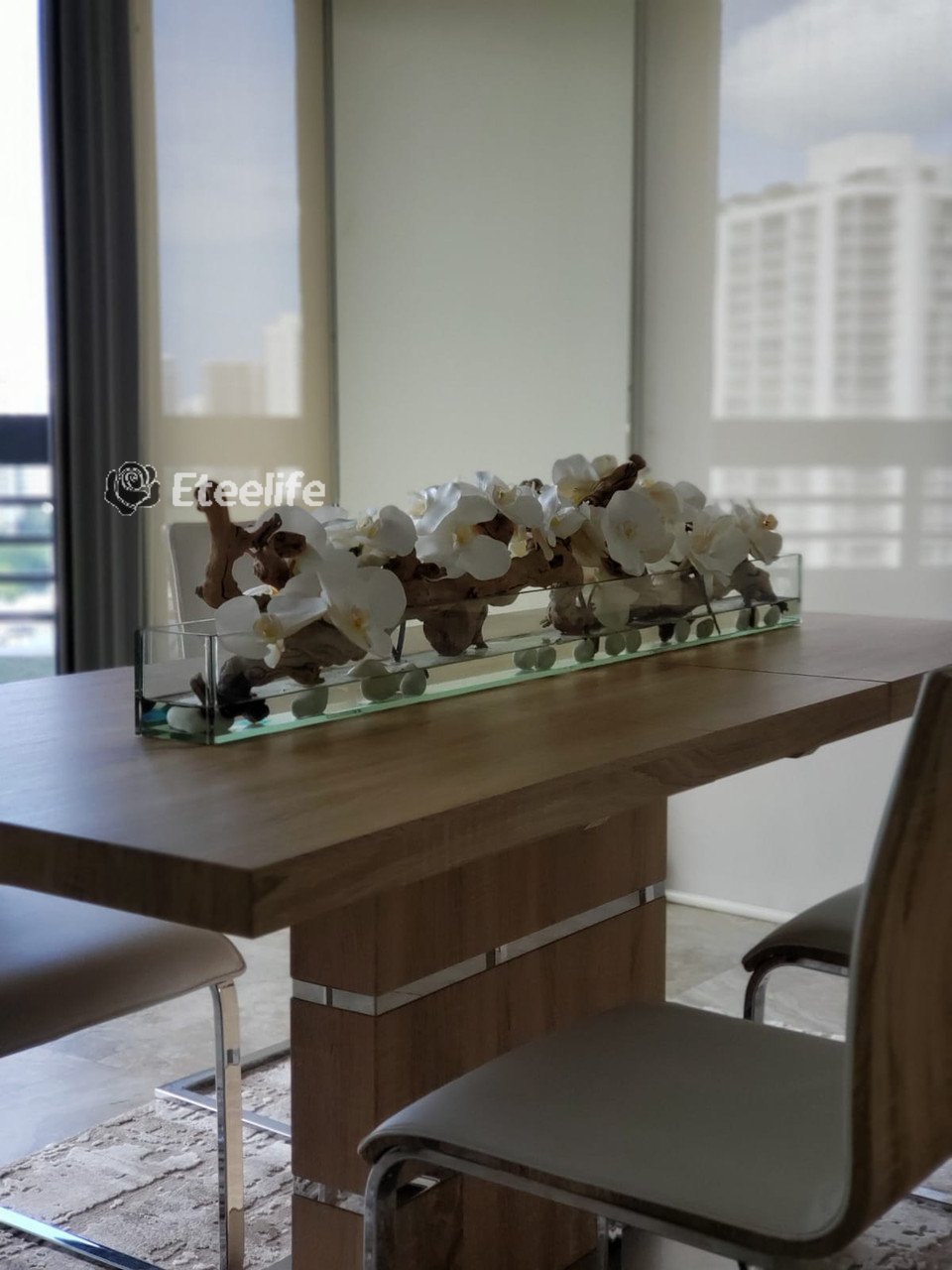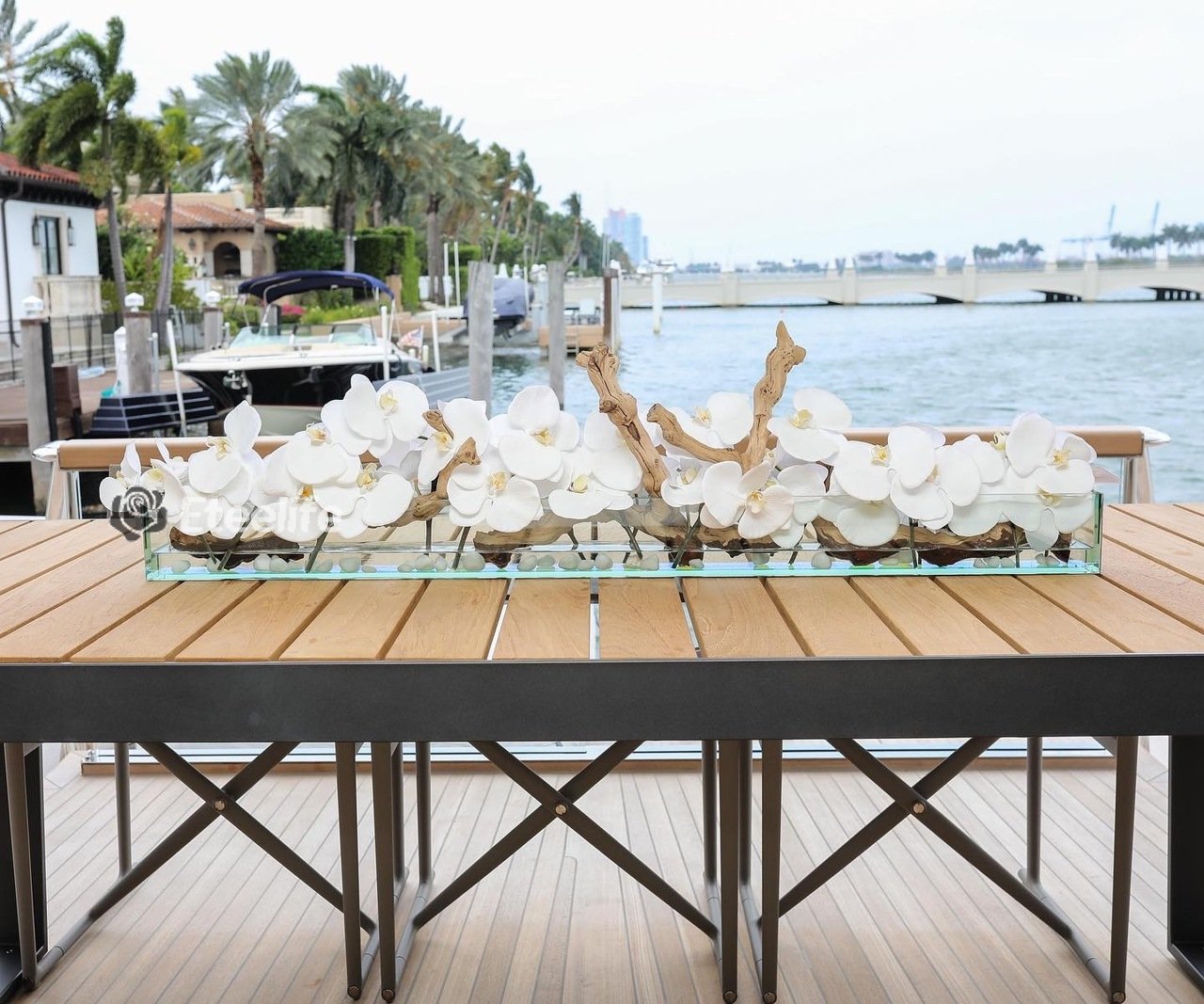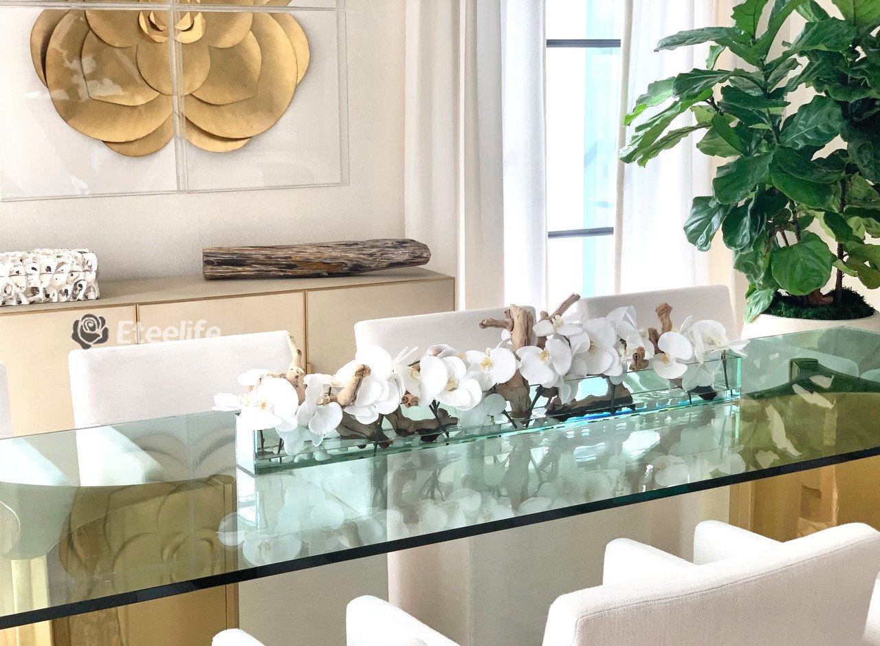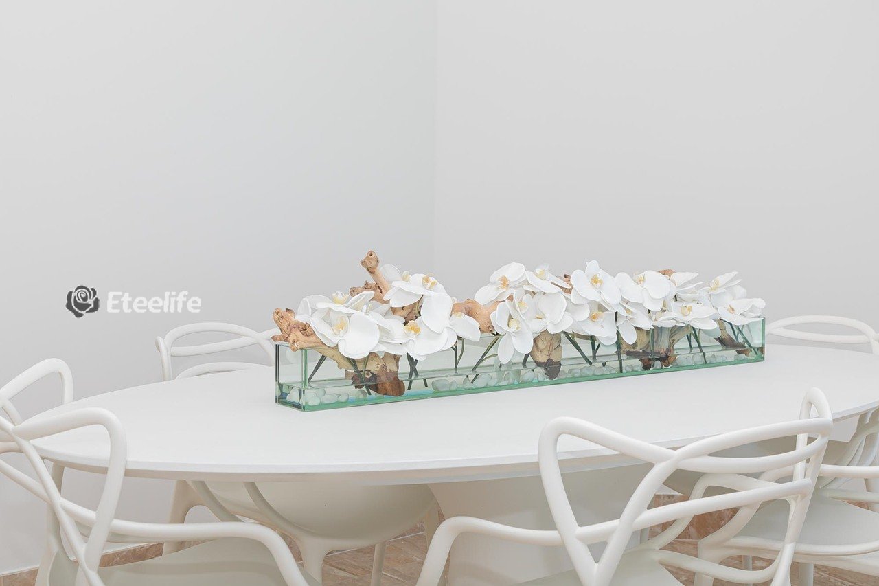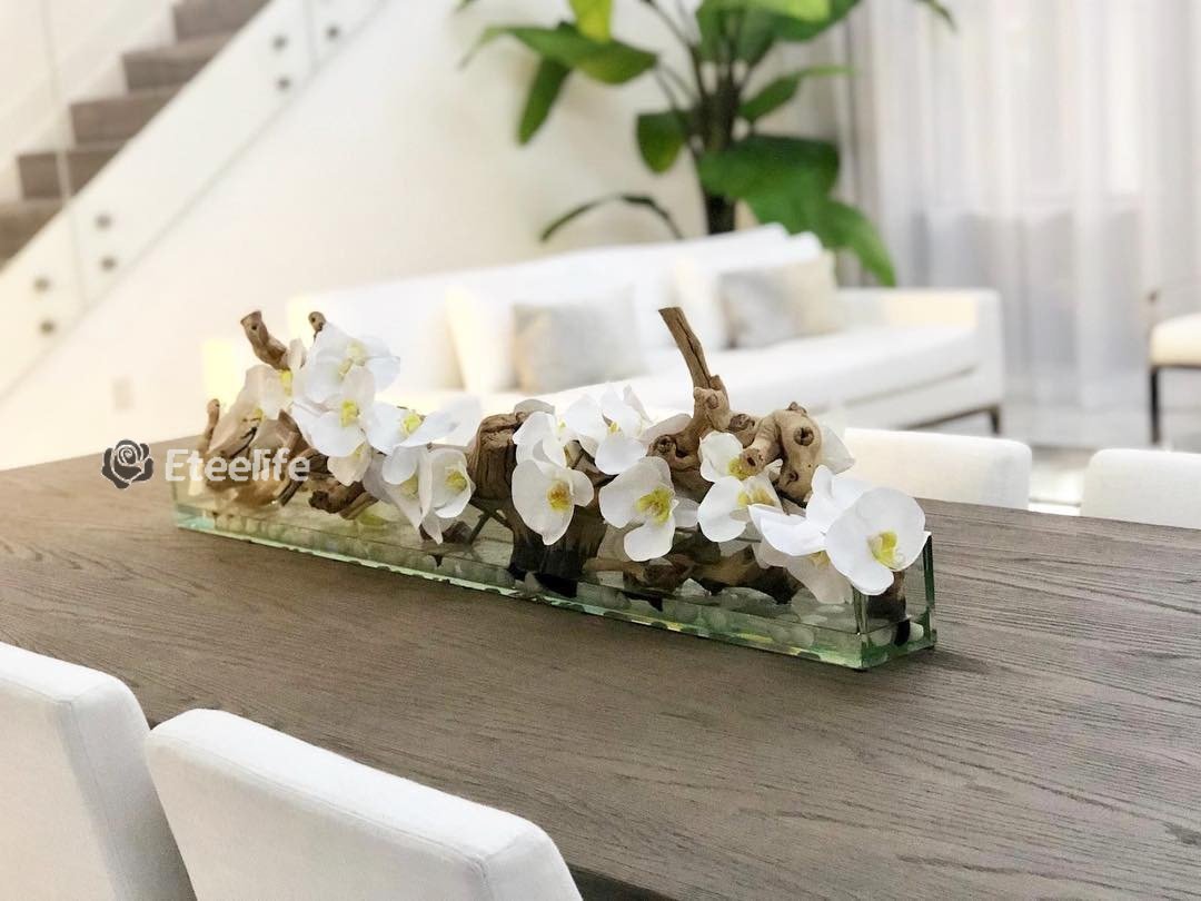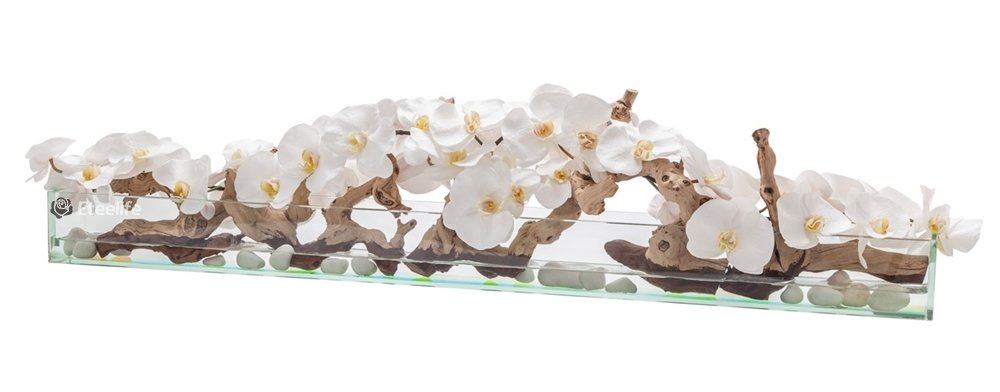 48″ Casa Moderna Glass Plate planter with white Phalaenopsis orchids, sandblasted grape wood, white stones and our illusion water. The stunning sight of a Phalaenopsis orchids in full bloom is nothing less than breathtaking. Their huge, curving petals; double rows of gorgeous blooms march along our casa moderna glass plate planter. This translucent modern glass planter features 90 degree angles and a modern linear design. The sight of a massed display of Phalaenopsis orchids is so arresting that we have paired it with natural sandblasted grape wood to achieve a beautiful and organic contrast.
