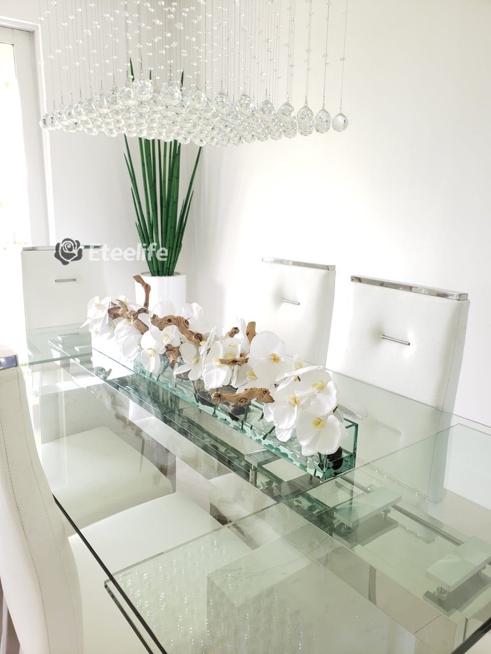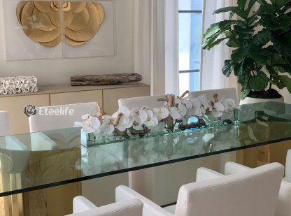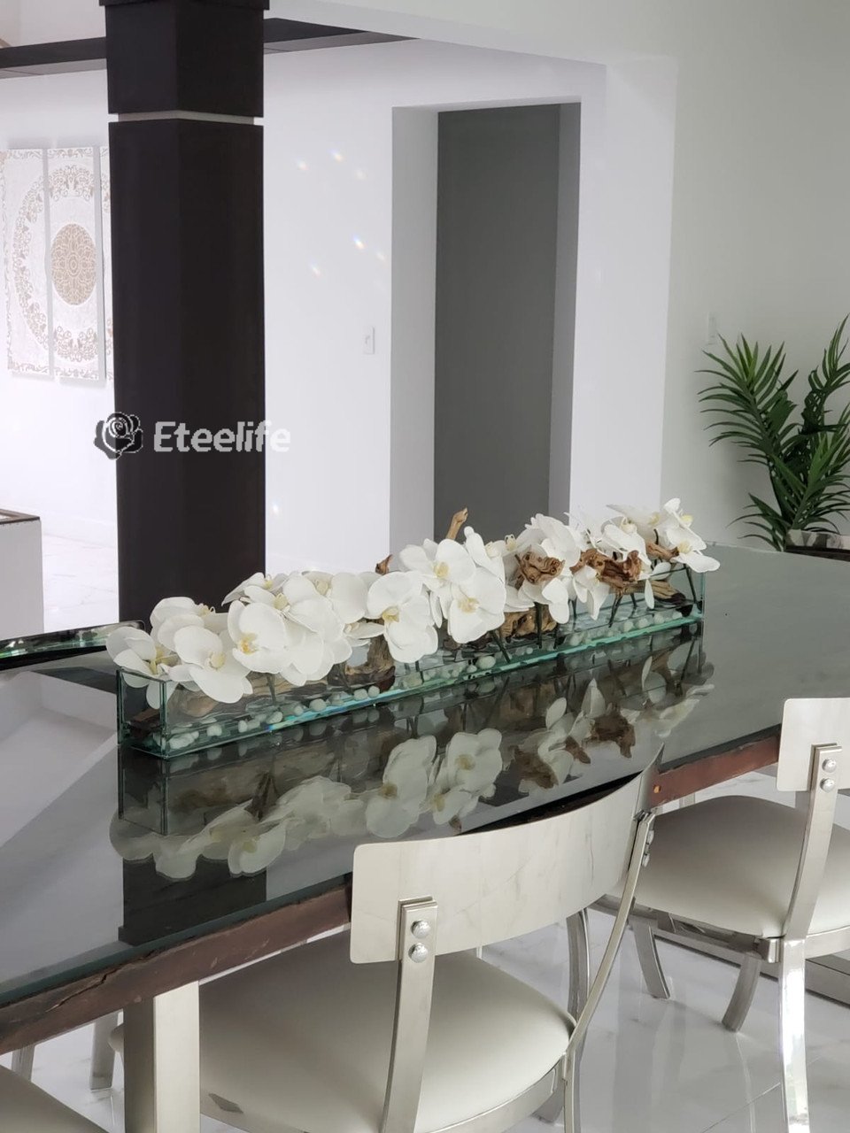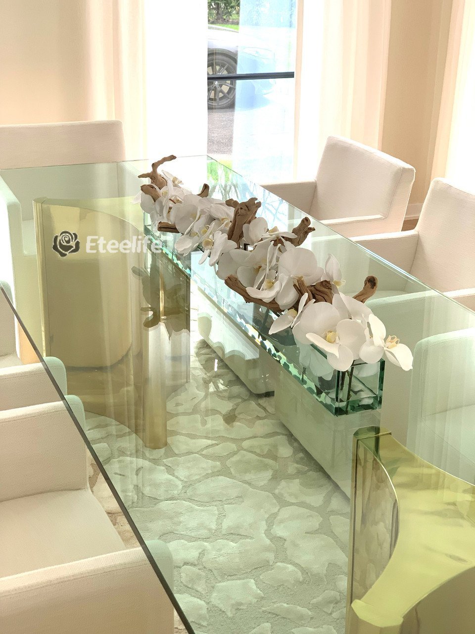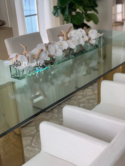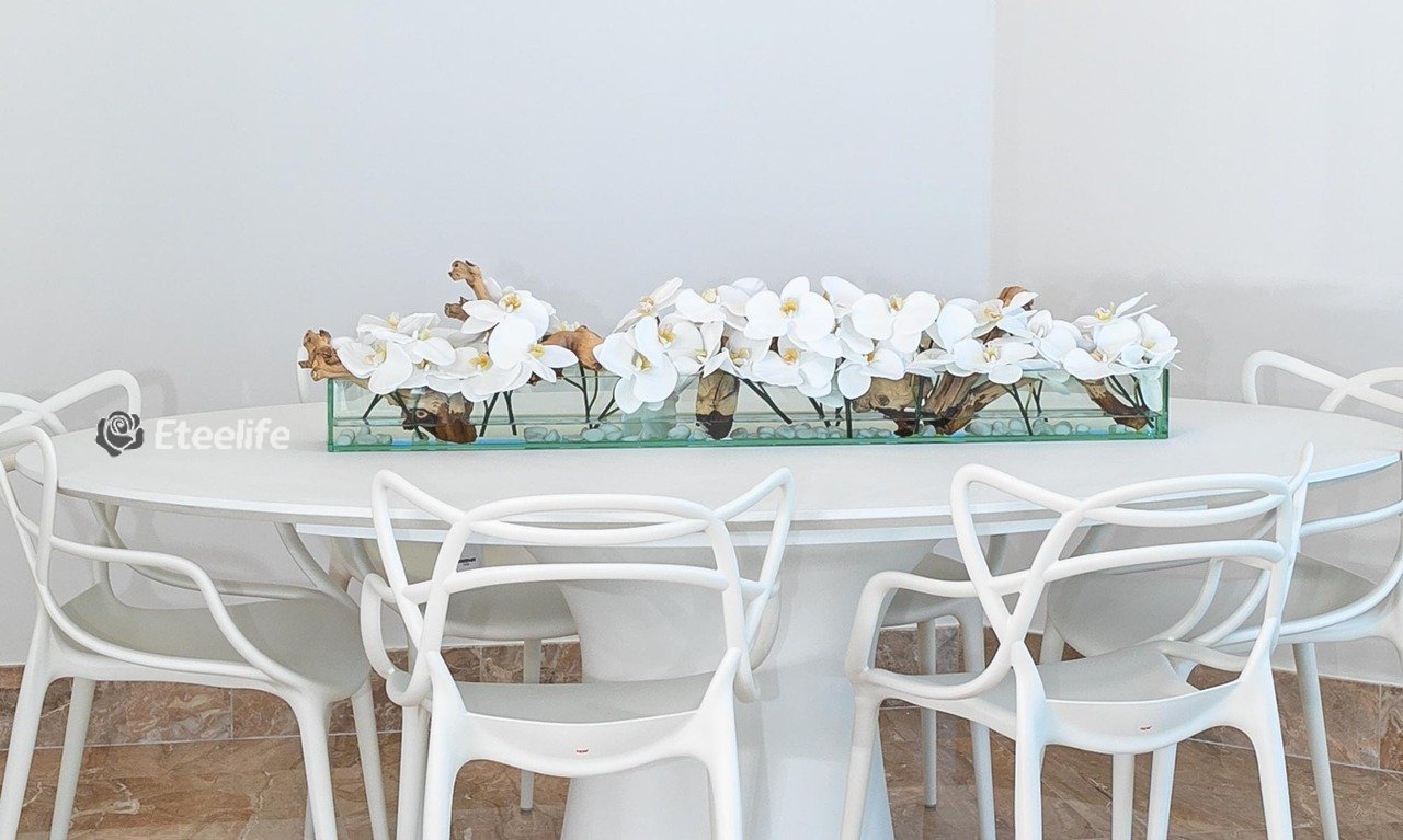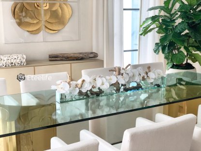48″ Casa Moderna Glass Plate planter with white Phalaenopsis orchids, sandblasted grape wood, white stones and our illusion water. The stunning sight of a Phalaenopsis orchids in full bloom is nothing less than breathtaking. Their huge, curving petals; double rows of gorgeous blooms march along our casa moderna glass plate planter. This translucent modern glass planter features 90 degree angles and a modern linear design. The sight of a massed display of Phalaenopsis orchids is so arresting that we have paired it with natural sandblasted grape wood to achieve a beautiful and organic contrast.