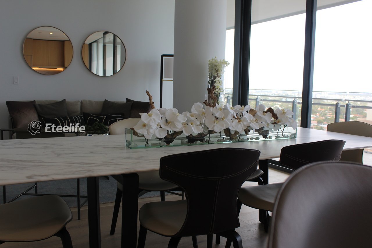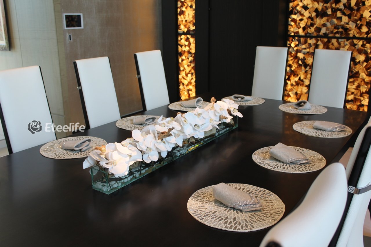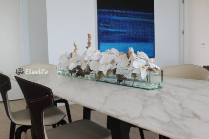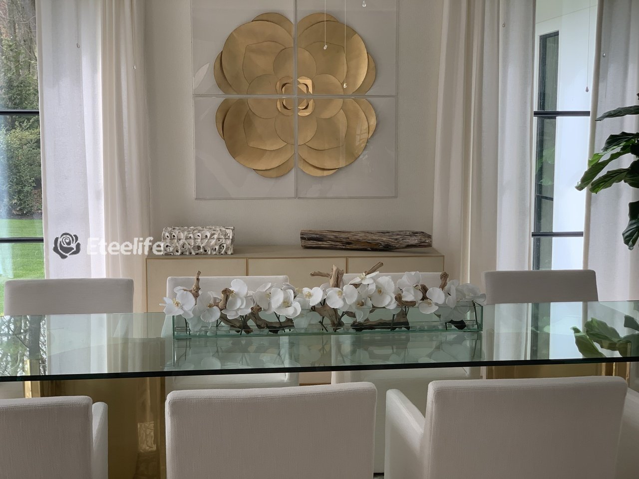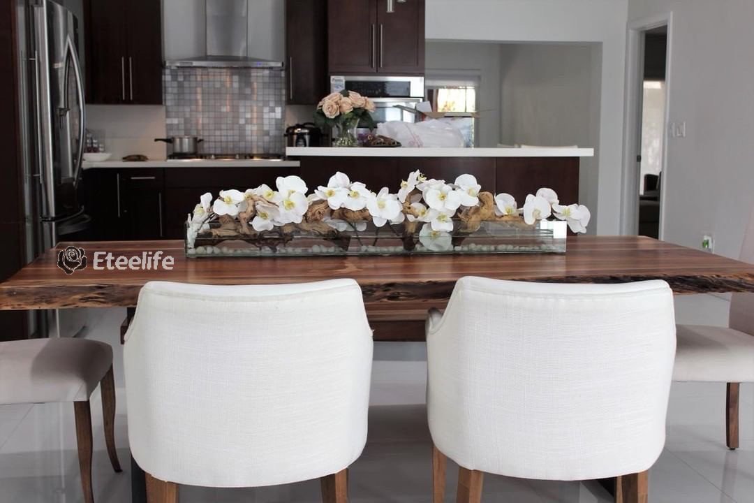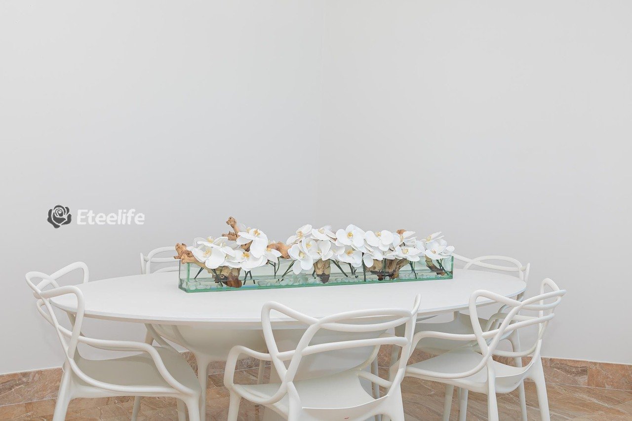 48″ Casa Moderna Glass Plate planter with white Phalaenopsis orchids, sandblasted grape wood, white stones and our illusion water. The stunning sight of a Phalaenopsis orchids in full bloom is nothing less than breathtaking. Their huge, curving petals; double rows of gorgeous blooms march along our casa moderna glass plate planter. This translucent modern glass planter features 90 degree angles and a modern linear design. The sight of a massed display of Phalaenopsis orchids is so arresting that we have paired it with natural sandblasted grape wood to achieve a beautiful and organic contrast.