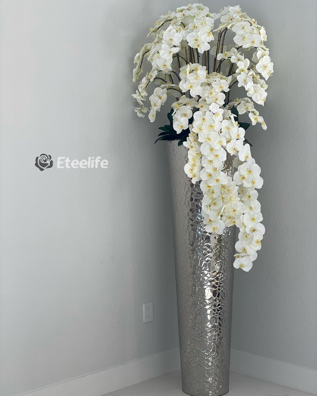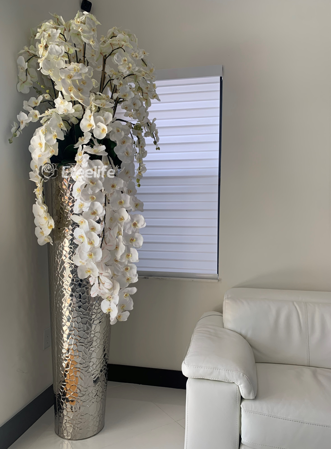 The ultimate luxury statement, this design features a extra tall hammered stainless steel tapered cone planter paired with beautiful cascading white phalaenopsis orchids. Each piece is carefully crafted to achieve a luxurious look. No need to water these beauties! Durable, they will last you years, and will remain beautiful year round! Designed with the upmost attention to detail and manufactured from top quality material, this piece is both luxurious and realistic.