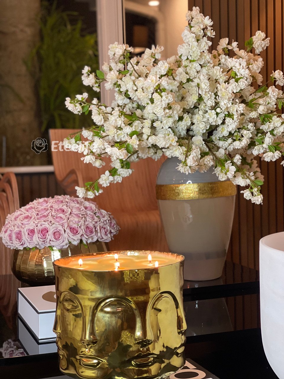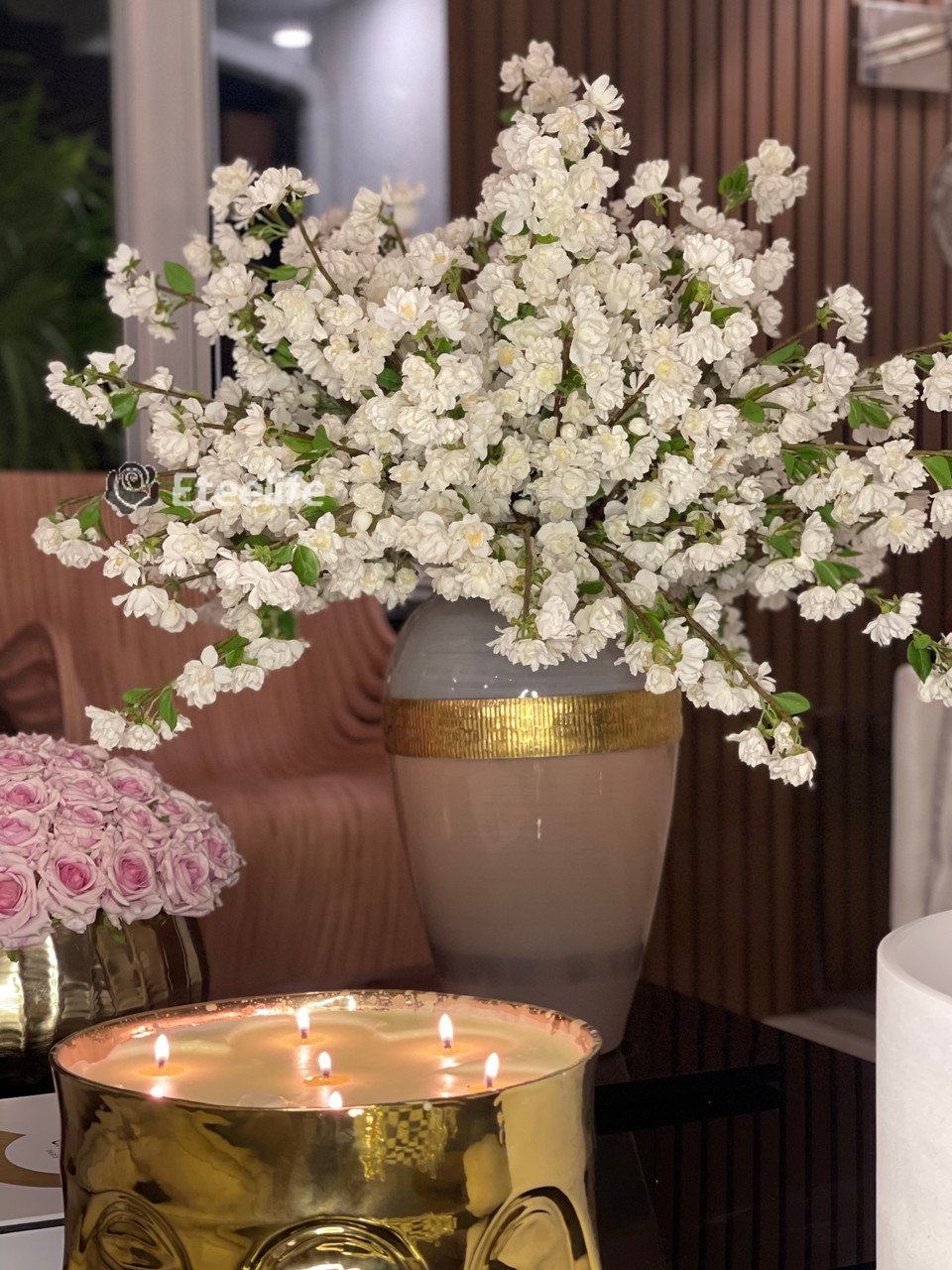 This bouquet of elegant white cherry a adds a fresh and stylish touch to any room. The branches are presented in a our goddess glass vase, anchored in illusion water and are the perfect decorative accent for a large coffee table or dining room console.