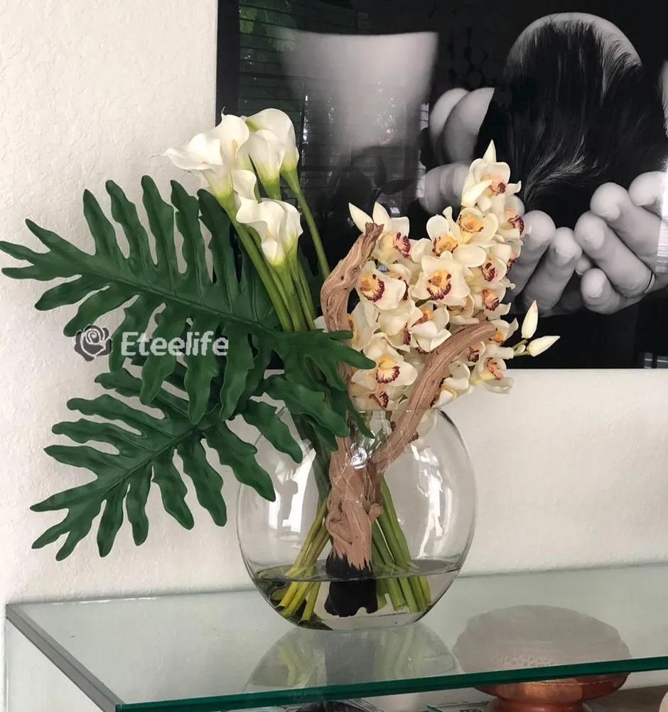 16″ Moon vase with a mixed bouquet of white Cymbidium orchids and white calla lilies set between Monstera leaves and sand blasted ghost wood.