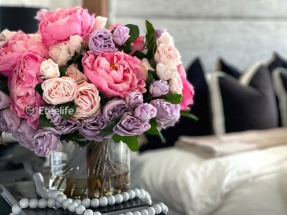 - Pink peonies, blush and lavender roses in various stages of bloom